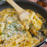 Add the tteokbokki into the pan and coat them in the fat. Cook for a few minutes to slightly crisp them on the outside. In the meantime, begin whisking the egg mixture. While whisking, slowly stream in about a ½ cup of the hot pasta water into the egg mixture to temper it.
