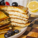 Top the pancakes with a pad of the lemon honey butter and fresh fruit. Serve with maple syrup and enjoy!