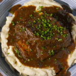 In the same pan, add in the onions. Sauté until translucent then mix in the garlic and ginger. Cook for 1 minute. In a separate bowl, combine the beef broth, miso paste, brown sugar, dark soy sauce, and Chinese cooking wine. Mix until the miso paste has dissolved. Pour this mixture into the dutch oven. Scrape up any brown bits stuck to the bottom of the pan with a wooden spatula to incorporate it into the sauce. Bring it to a bubble then remove the dutch oven from heat.