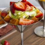 Portion the cake cubes into the serving glasses. Add a dollop of the mascarpone whipped cream. Drizzle on the matcha sweetened condensed milk. Top with strawberries and enjoy!
